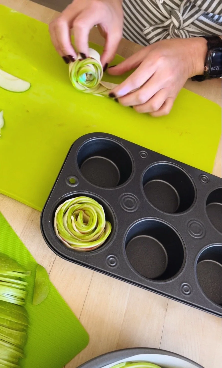 Starting from one end loosely roll your apple pastry strip into a rose and place directly into a muffin tin. By rolling loosely it gives the pastry room to expand while baking.