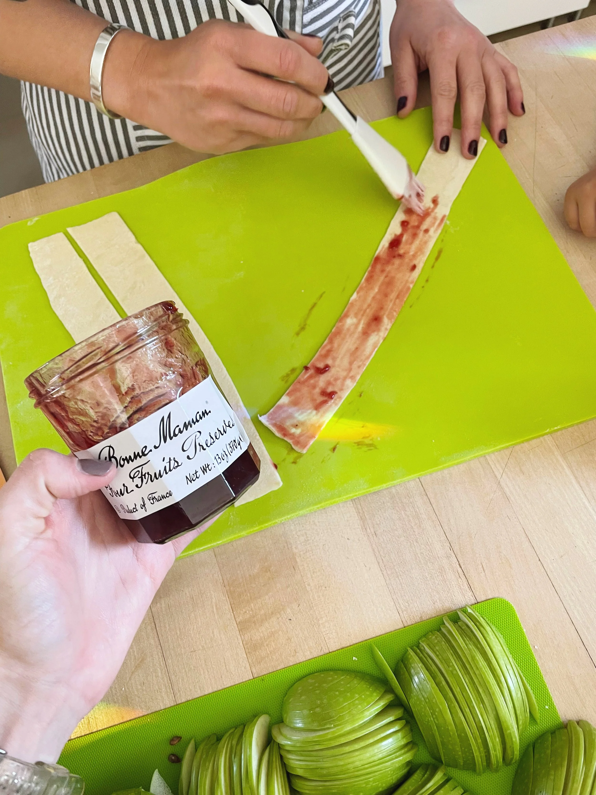 Lay out a strip of puff pasty, brush jam onto puff pastry. Use the jam as glue.