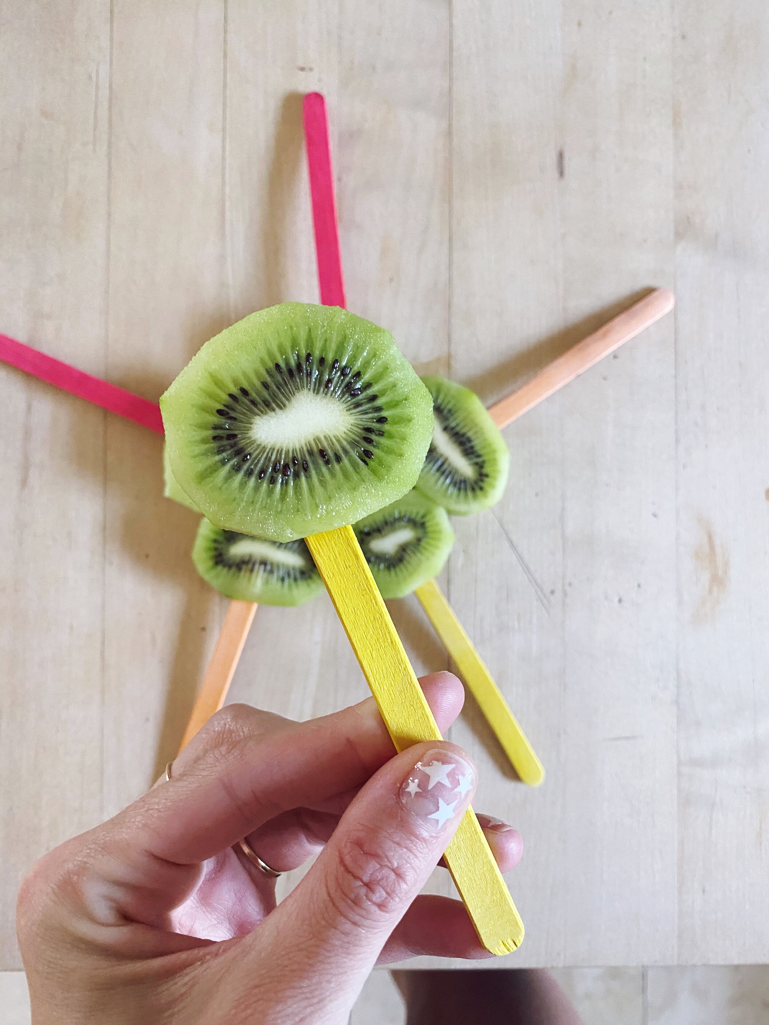 If you’re a parent, you know that popsicles can be tricky. Some are loaded with sugar, and others can just taste gross. The kids and I have been LOVING frozen fruit on a stick. Yes, it’s that simple. Slice up a kiwi, add a stick, pop it in the freezer for a couple hours and ENJOY. It’s so refreshing. One of our (Q’s) favorite summer snack options!