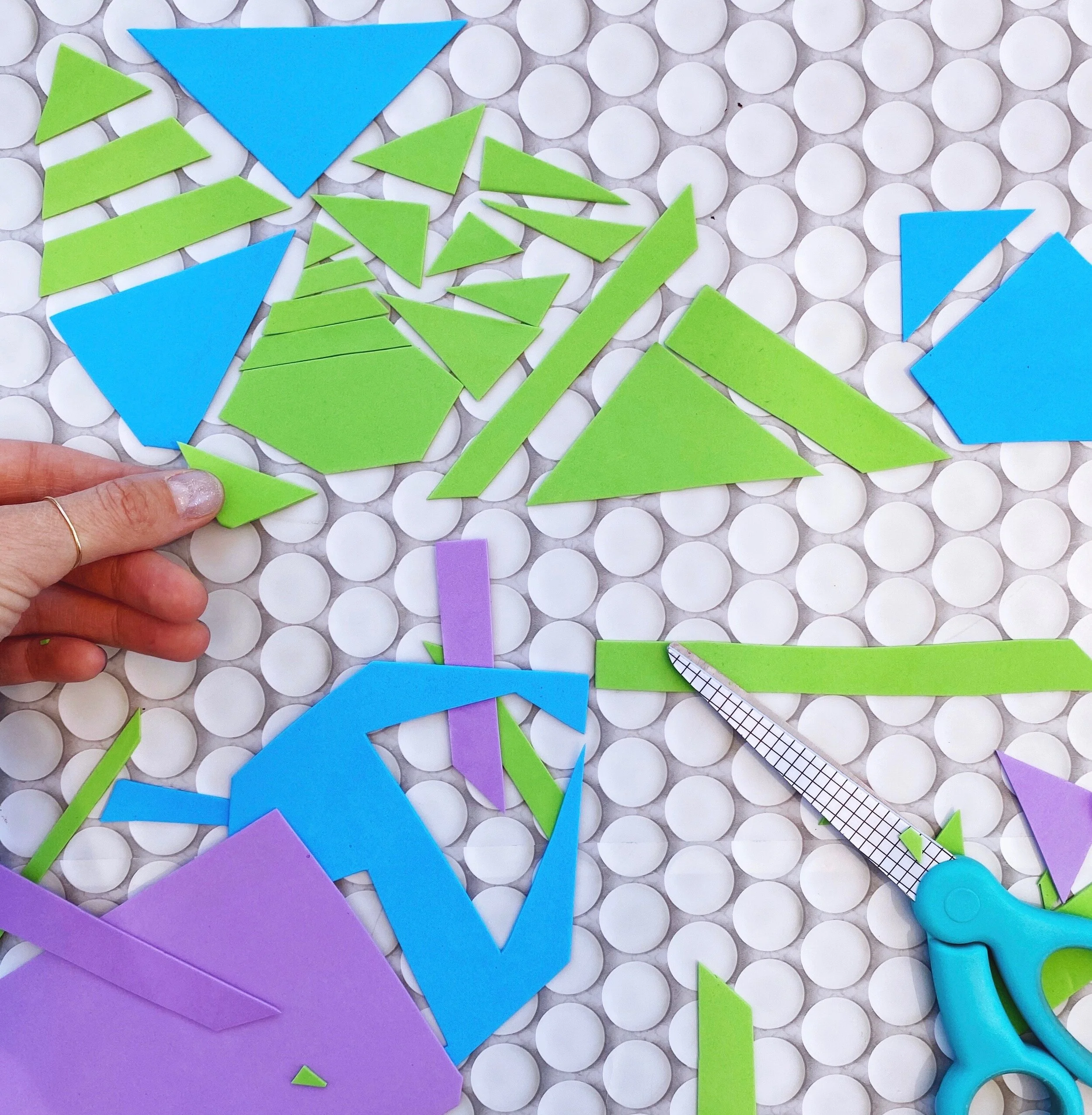 First, cut out different geometric shapes from the foam sheets. You can do any design you want. I chose random geometric shapes for a modern look. The foam will give the 3D raised look on the pot.