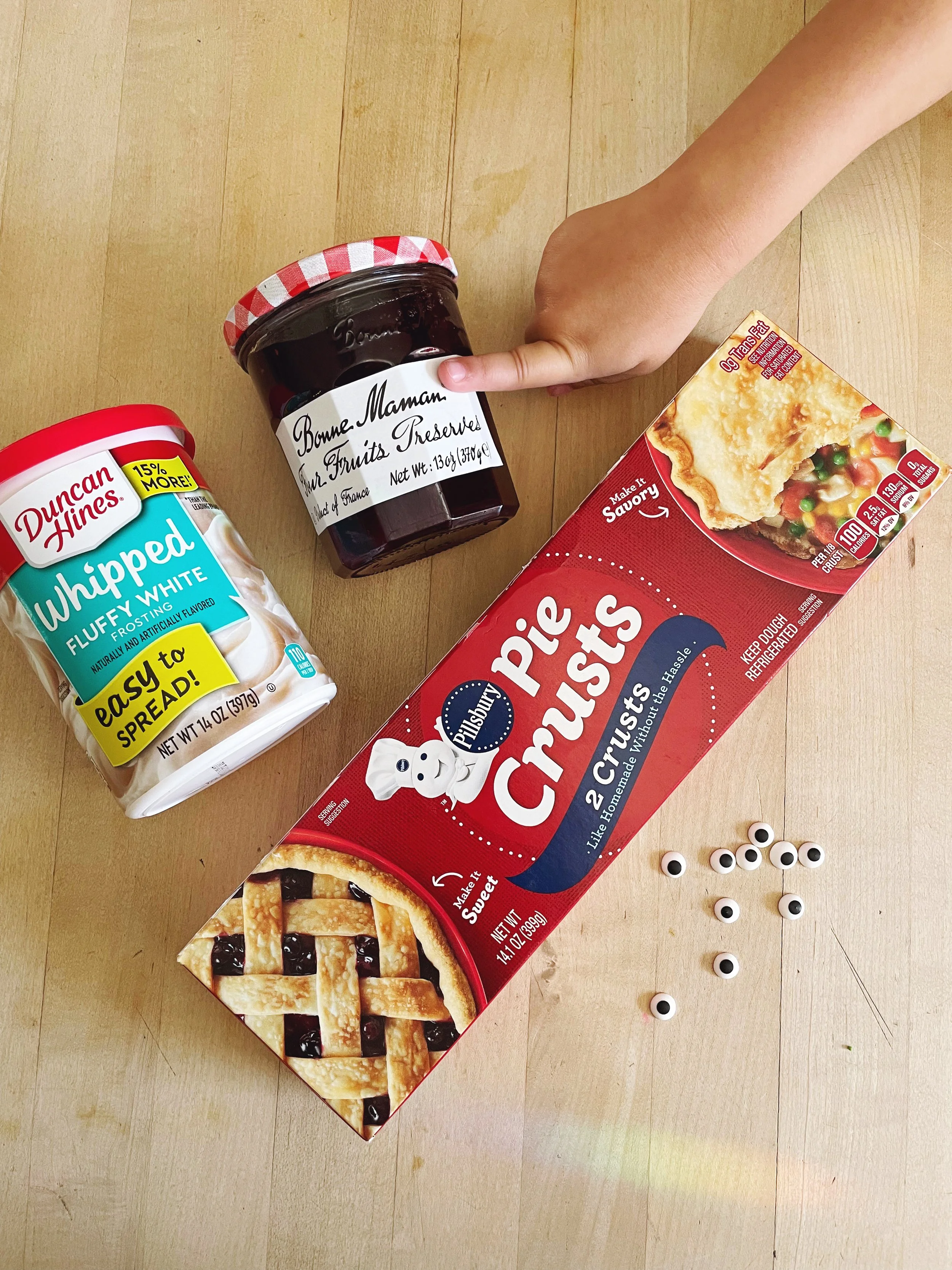 Place the leftover crust strips from step 2 across each rectangle, in a mummy-like fashion! You can add as few or as many as you want. You can also use the second pie crust to cut more strips.