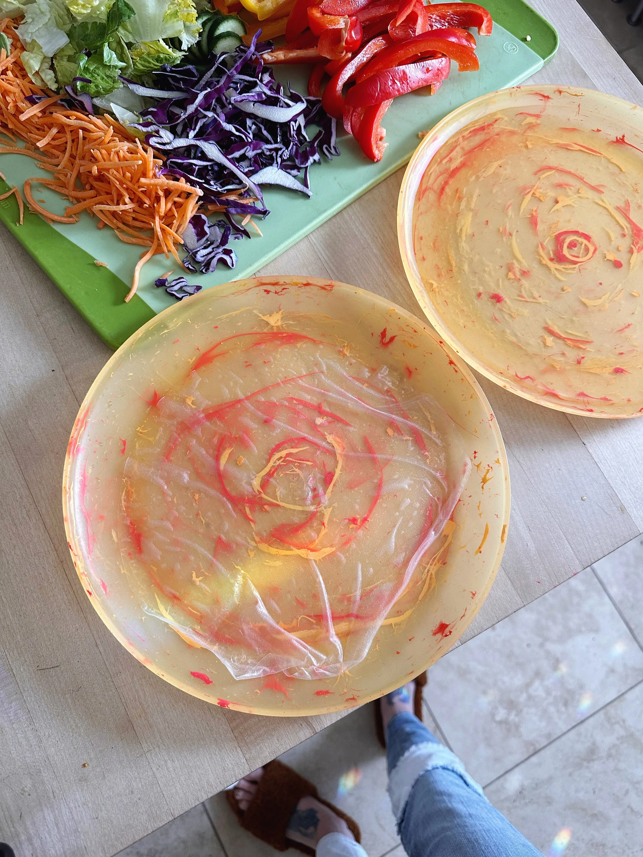 Step 2. You’ll use two large plates to assemble the spring rolls. Add warm water to one plate. You’ll rotate, placing the hard wrap in the warm water until flexible and gummy, and then moving it to the empty plate to assemble the roll.