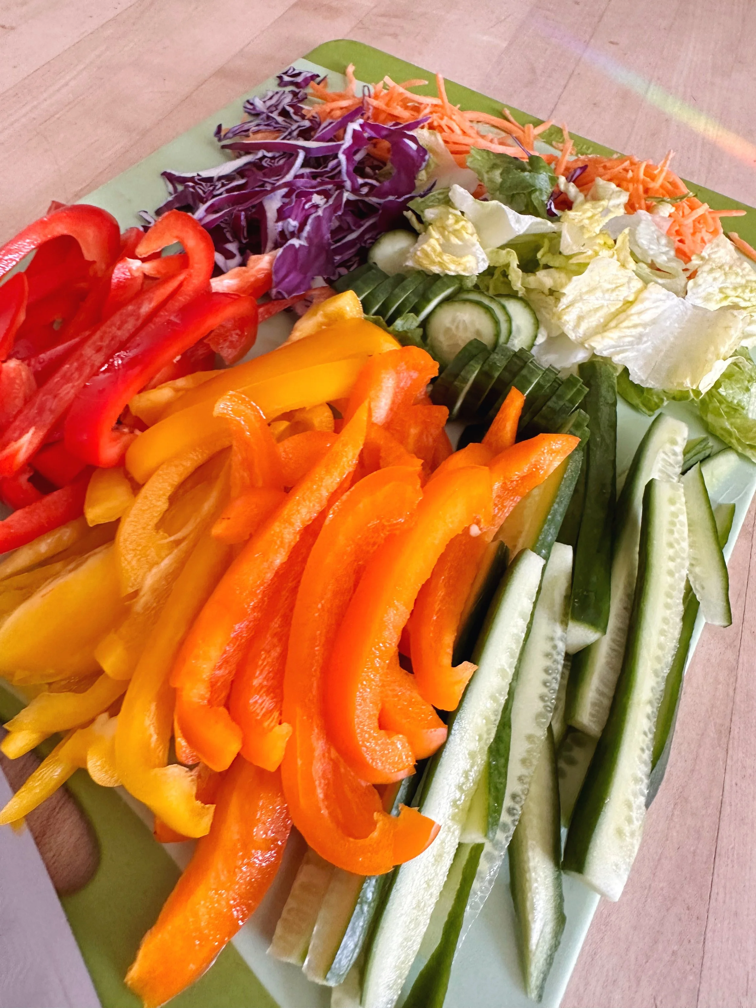 Step 1. Prep filling and veggies. I chop most of the veggies into sticks, close to the length of a spring roll. I also slice the (cooked) pork chop thin and keep it cold, straight from the fridge.