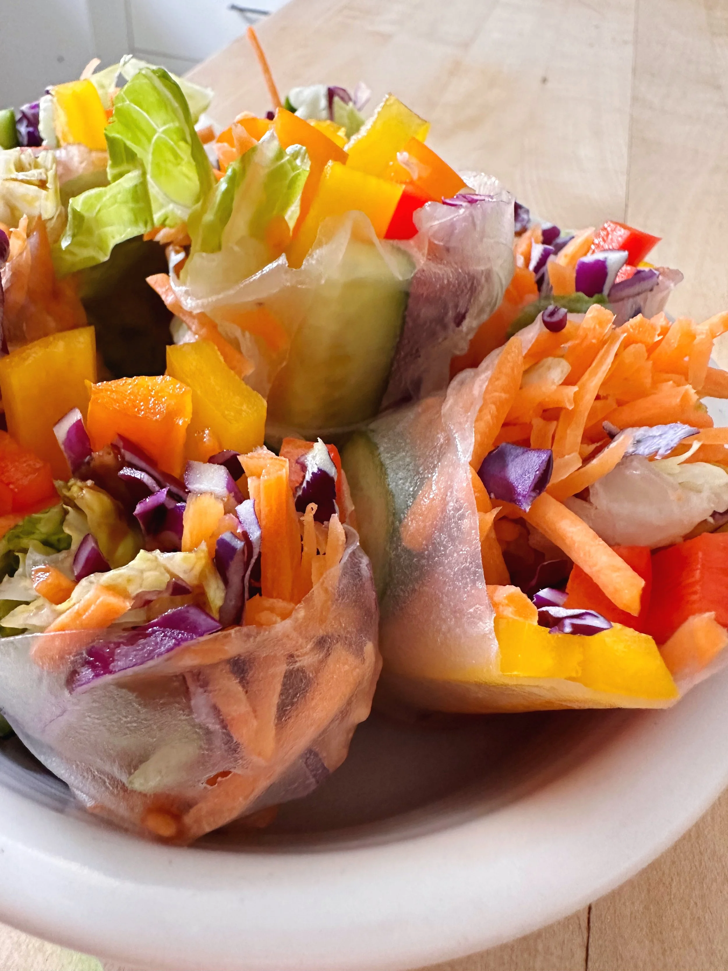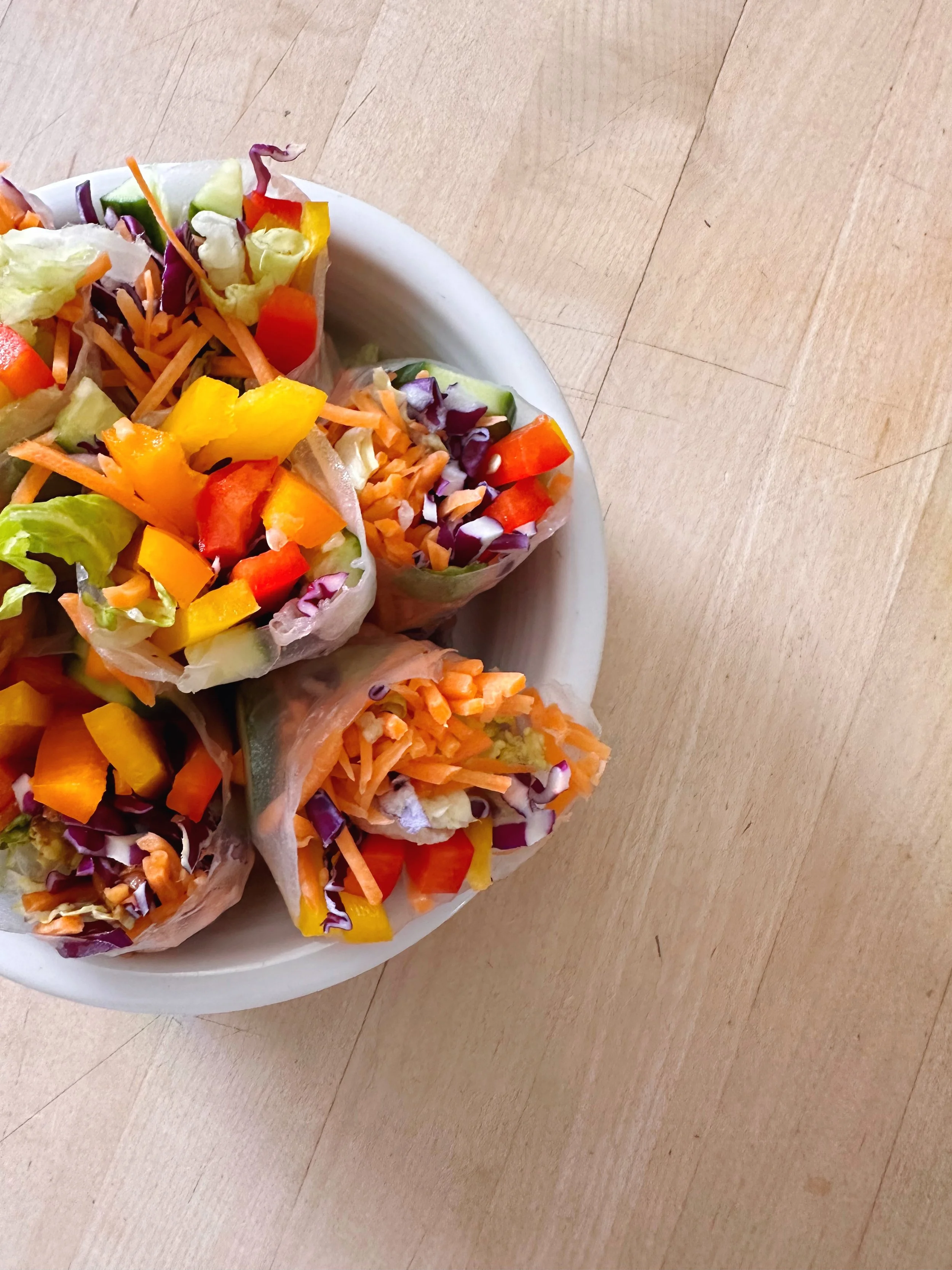 These rainbow spring rolls are beautiful and delicious anytime of the year, but I especially crave them as the weather starts to warm up. Spring rolls are so versatile – you can use whatever crunchy veggies you have on hand to make them. Usually when I make spring rolls, it’s on fridge cleanout day!